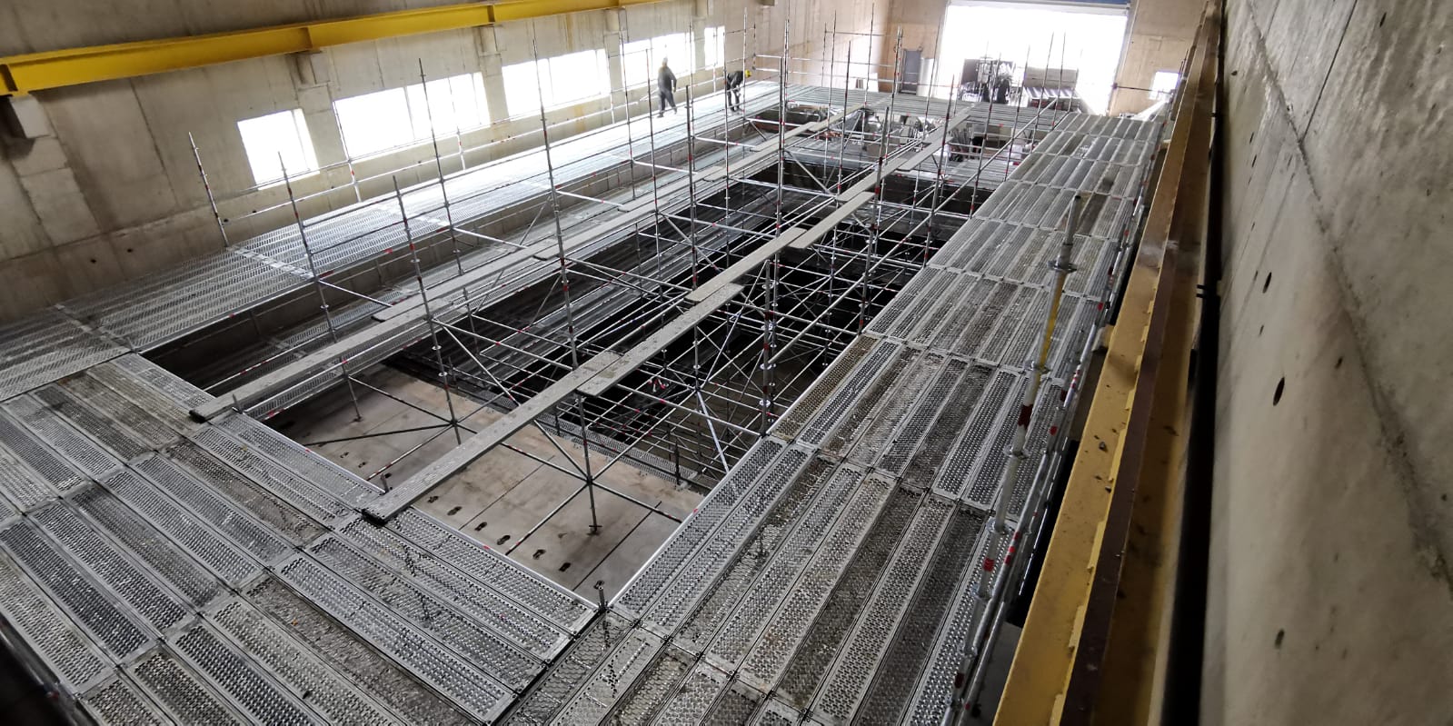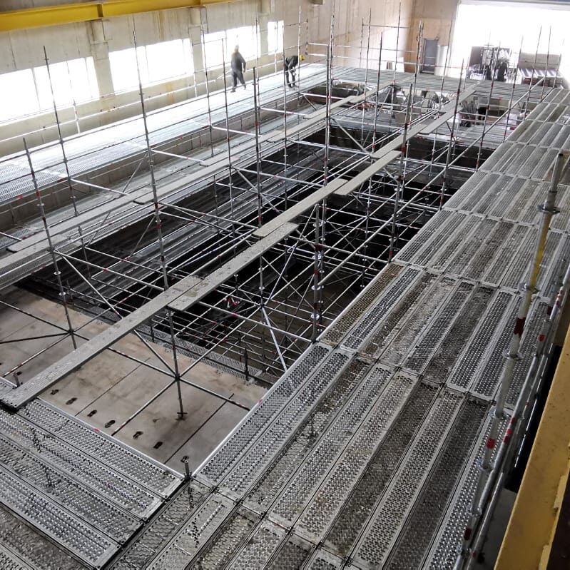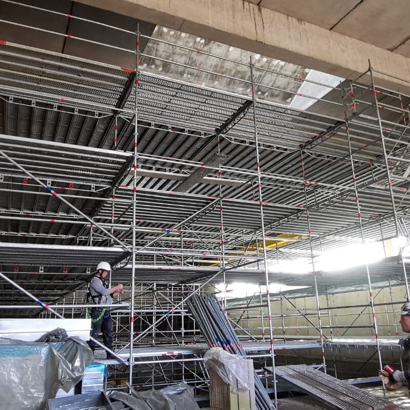 Für die Deckendemontage in einem Bad in Merzig wurde ein Arbeits- und Schutzgerüst in Modulbauweise errichtet. Aufgrund der baulichen Gegebenheiten war eine Verankerung am Bauwerk nicht möglich, daher wurde das Gerüst freistehend konstruiert und speziell gesichert.